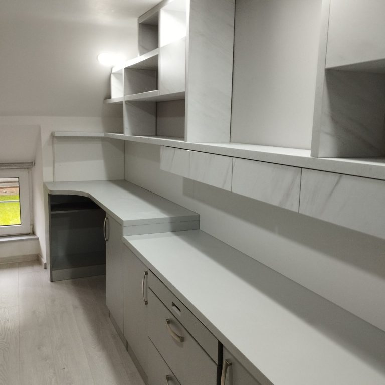 This project involved designing a cozy attic room for children, creating a multifunctional space where they can study, pursue hobbies, relax, and sleep comfortably. The room features shelves lining the walls and a long desk surface perfect for homework, crafts, and art projects. It’s a warm, inviting place tailored for both learning and living.