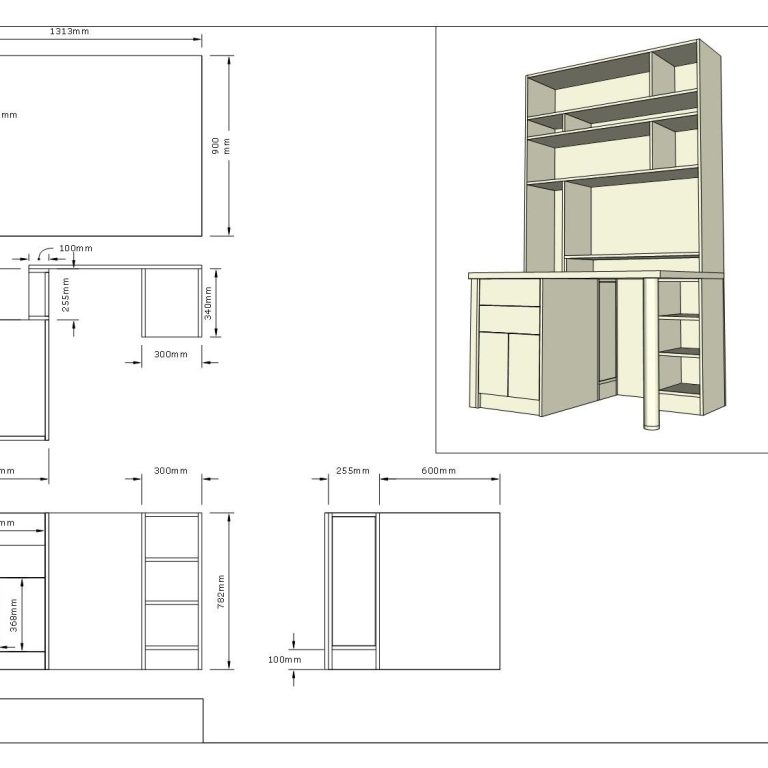 Downloadable archive and self-assembly computer desk with shelves.